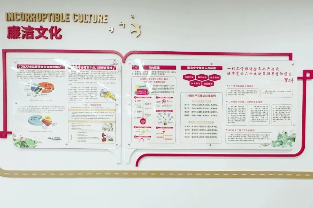 依托公司走廊,打造融教育、观赏、警示于一体的廉洁文化墙。从“习近平总书记关于推进全面从严治党重要指示精神”“国有企业领导人员标准”“中国共产党廉洁自律准则”“六大纪律解读”“中央八项规定精神解读”“2022年监督检查审查调查情况”六个板块向大家传递了廉洁之声。图文并茂,寓意深远,使廉洁文化入眼、入脑、入心。