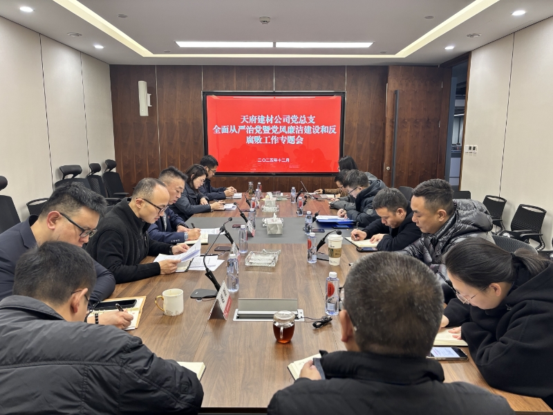 12月19日,天府建材公司党总支召开全面从严治党专题会,系统研判当前党风廉政建设形势,安排部署下一阶段重点工作任务。 会议集中学习了《习近平关于加强党的作风建设论述摘编》,纪检委员通报了在日常监督中发现的苗头性、倾向性问题。党总支书记听取其他领导班子履行“一岗双责”、落实党建工作责任情况的汇报,并逐一提出针对性要求。会议还研究了“以案促改”相关工作,并就公司进一步抓好全面从严治党工作作了安排部署。