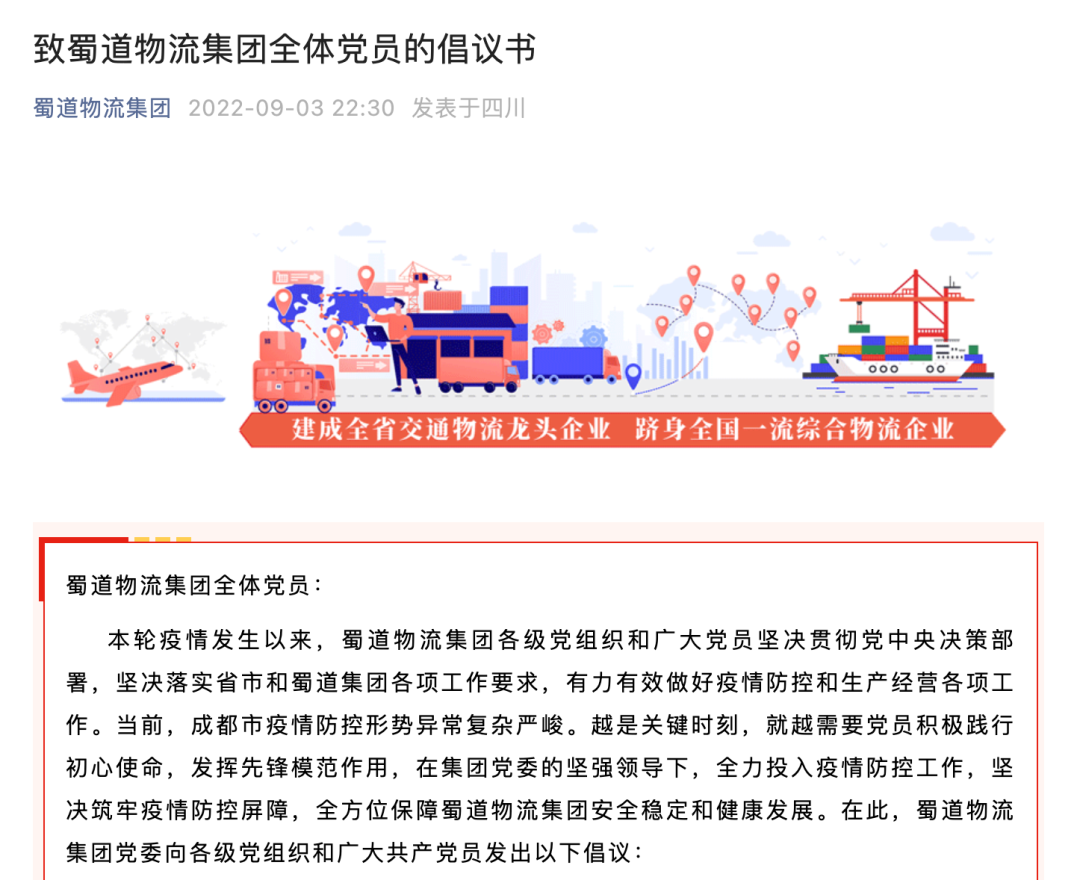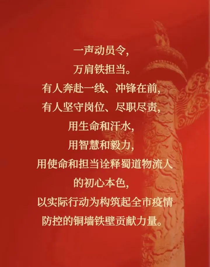 当前,面对成都市近期疫情防控严峻复杂形势,蜀道物流集团党委迅速落实市委市政府决策部署,积极响应蜀道集团党委号召,组织发动集团各级党组织和广大党员干部践行国企担当,迅速投入疫情防控工作,为打赢疫情防控阻击战贡献力量。